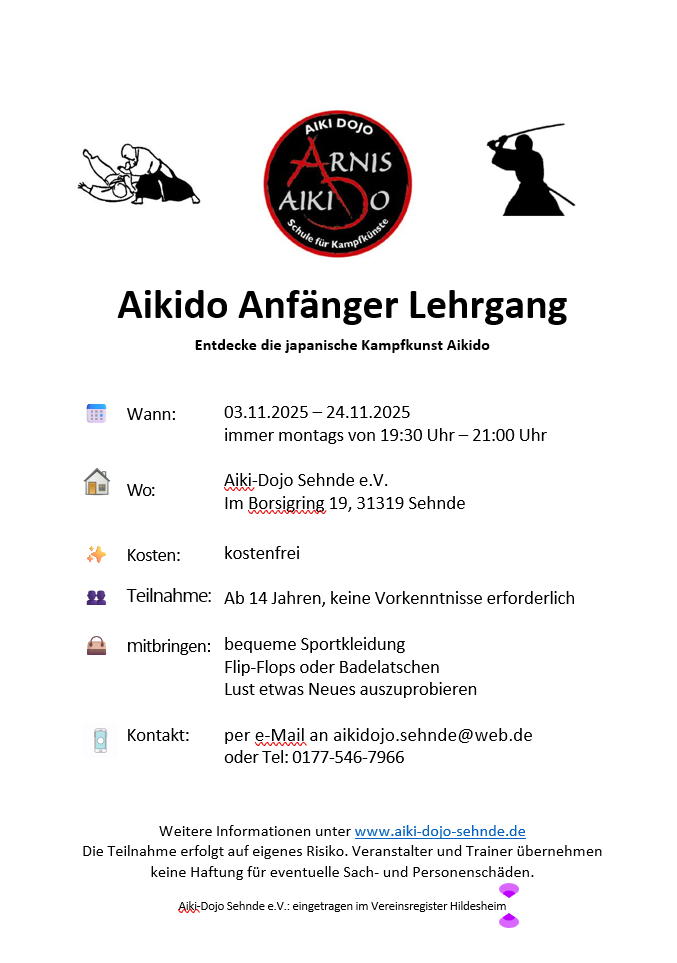 Ab dem 3. November 2025 können Jugendliche ab ca. 14 Jahren und Erwachsene an vier aufeinanderfolgenden Montagen von 19:30 – 21:00 Uhr teilnehmen. Das Training umfasst Gymnastik, Einführung in die Fallschule, Basistechniken und Atemübungen. Die Lehrgänge sind kostenfrei. Weitere Informationen, Adresse und Anfahrt gibt es unter: www.aiki-dojo-sehnde.de.